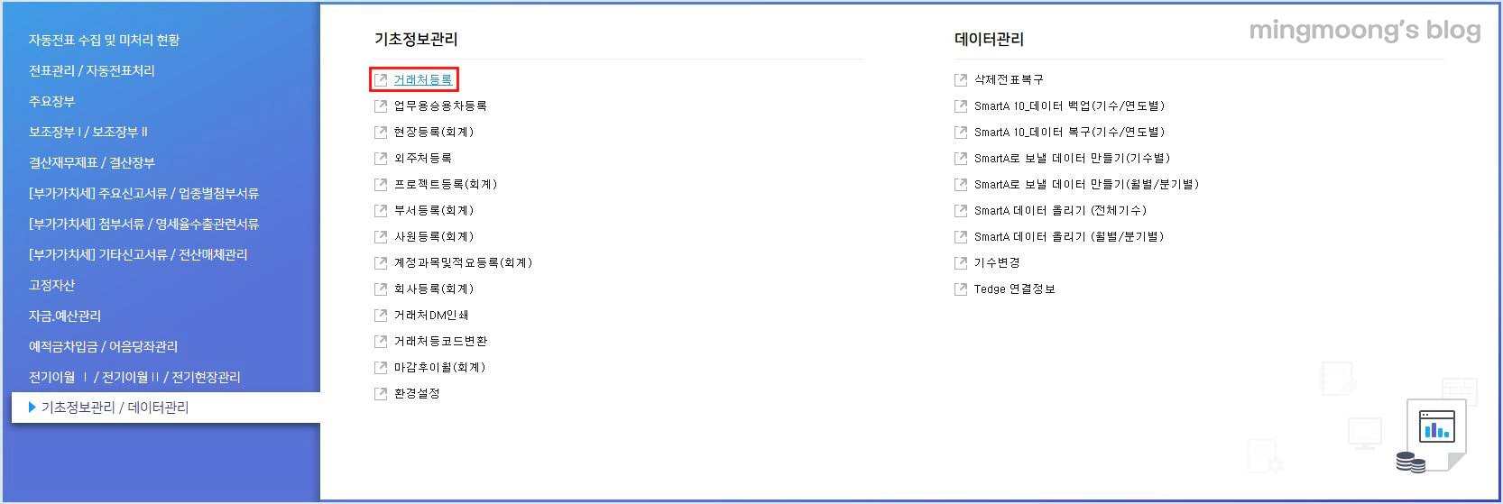 [기초정보관리/데이터관리] > [기초정보관리] > [거래처등록] 순으로 눌러줍니다.