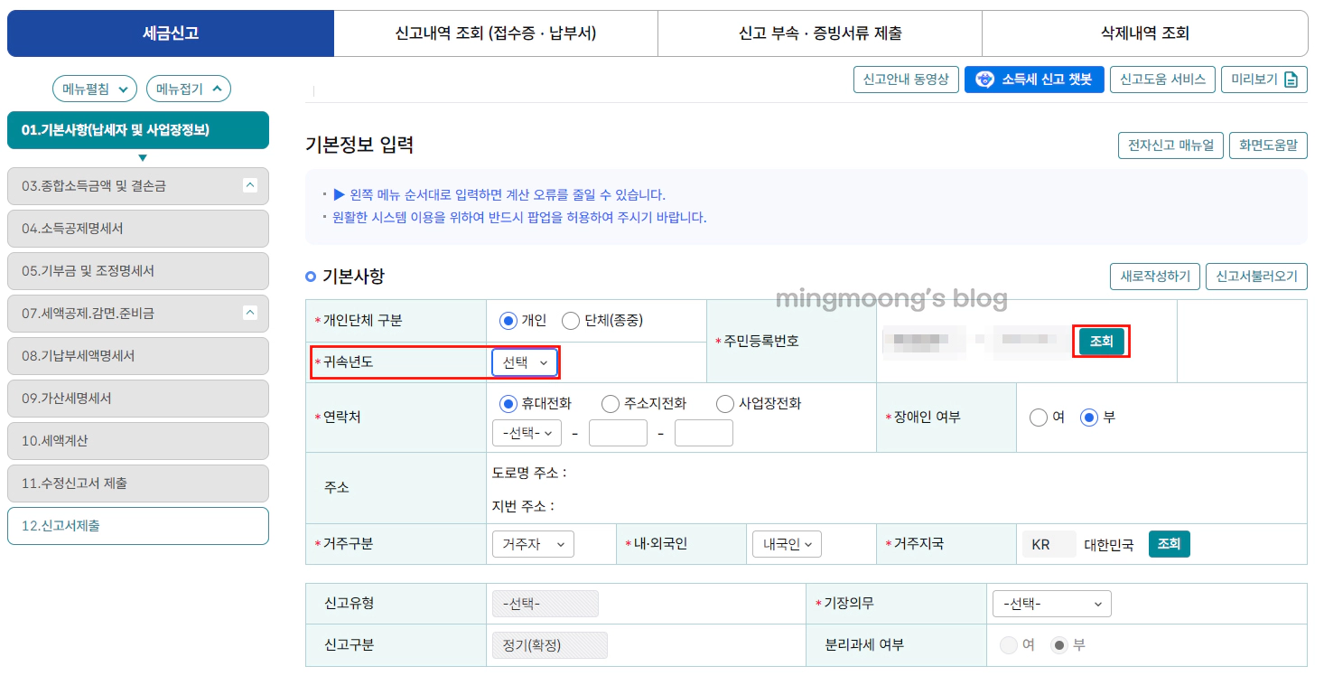 수정해야할 귀속년도를 선택 후 주민번호 옆 [조회]를 눌러줍니다.