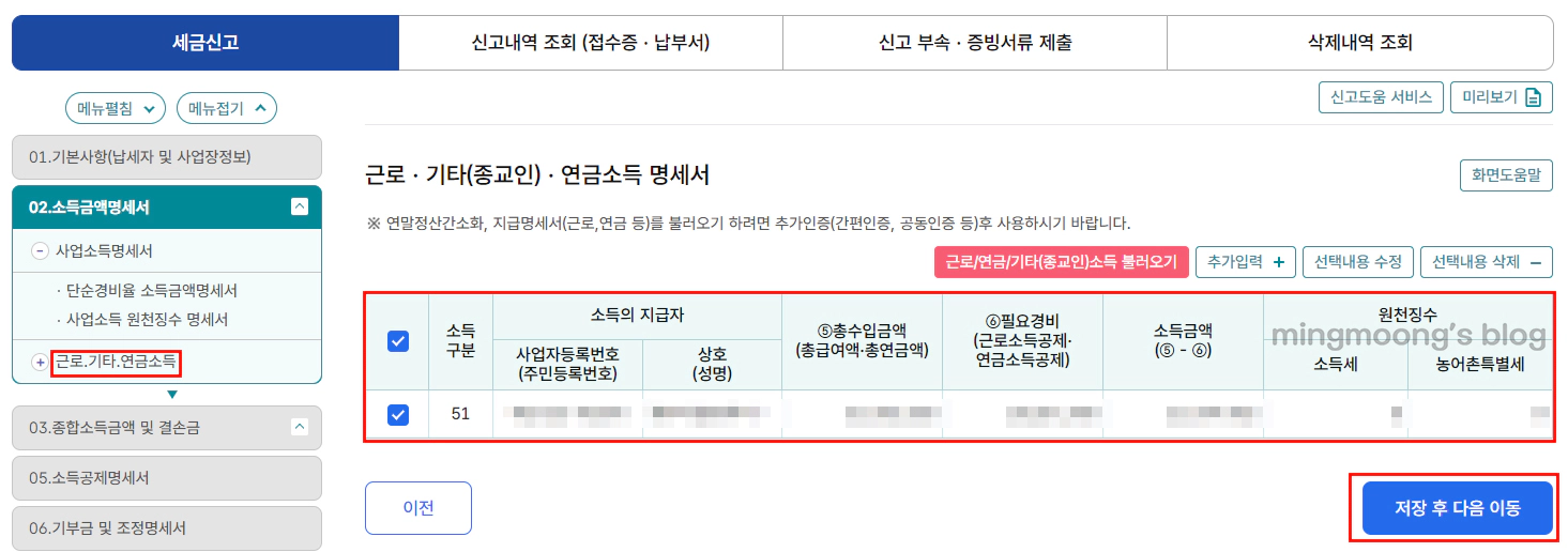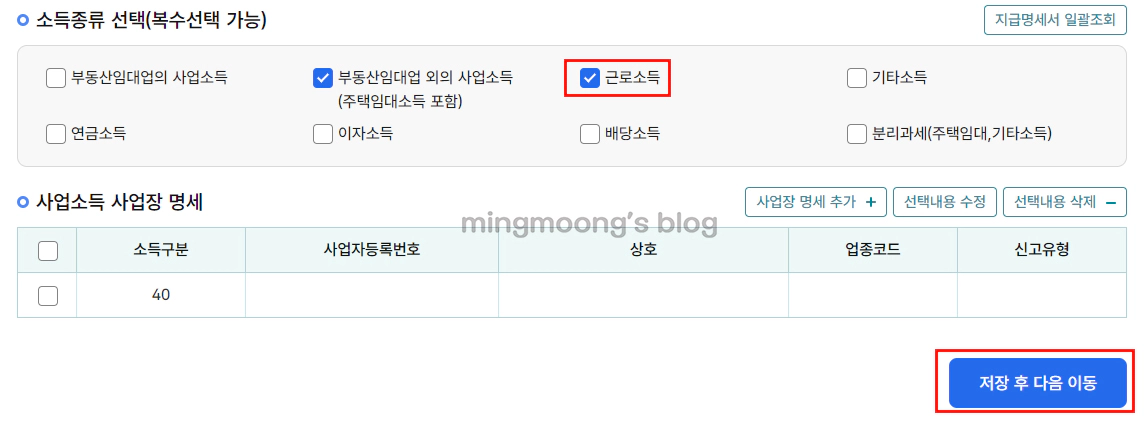 일한 곳의 상호와 수입금액 등 불러와진 내용이 맞는지 확인해준 뒤 [저장 후 다음 이동]을 눌러줍니다.