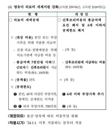 개정안은 산후 조리비용의 총 급여액 요건이 폐지되고 6세 이하자 공제한도까지 폐지가 됩니다.